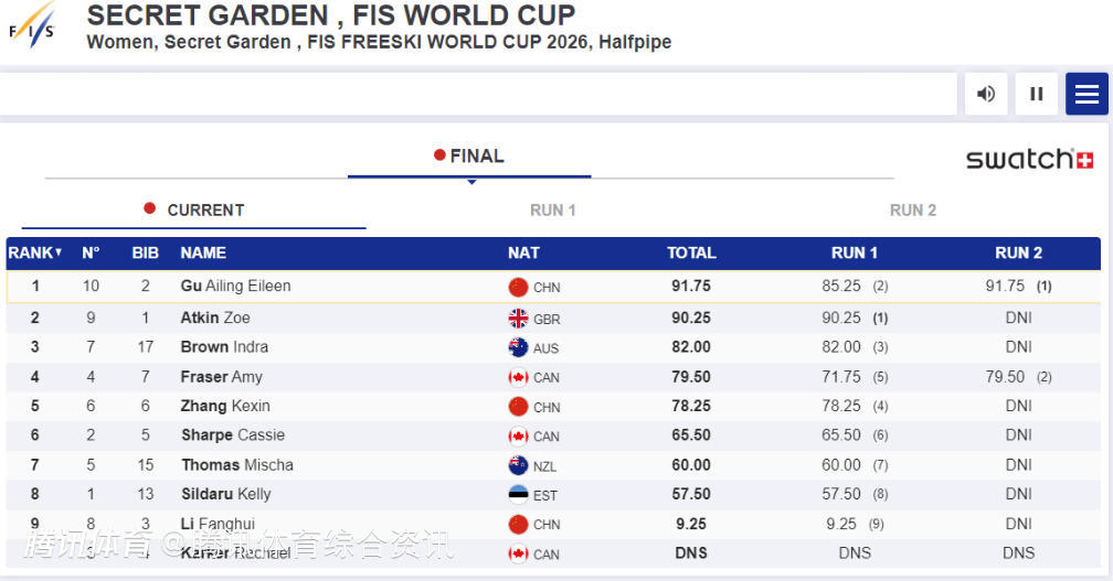 谷爱凌第一跳85.25分,排名第二,落后于英国选手佐伊-阿特金(90.25分)。不过,谷爱凌第二跳获得91.75分,超过阿特金,收获自己本赛季世界杯第一冠,也完成了U型场地世界杯云顶站的三连冠,阿特金获得亚军。