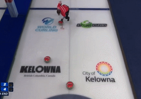 霍尔特曼想硬旋轻磕,结果正好碰到占位壶被改变路线...但很可惜,这颗被改变路线的红壶恰好被中国两颗黄壶挡住,否则他们就不是被偷1分,而是3分了!