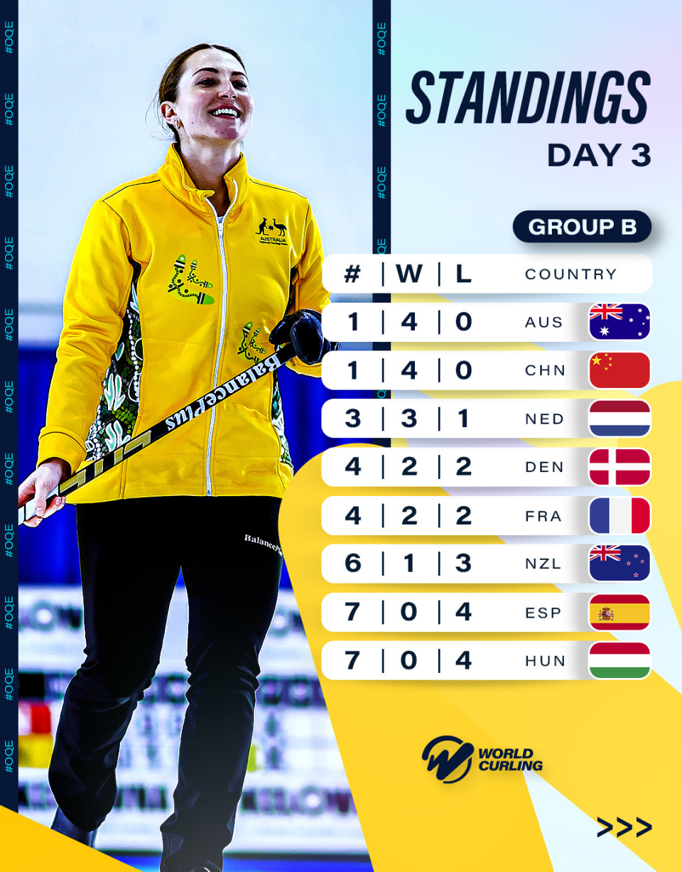 目前中国和澳大利亚都是四战全胜并列第一,两队的交手要等到最后一轮,所以接下来两场都不容有失。荷兰队3胜1负排在第三,也是晋级种子之一;但他们5-7不敌中国,被胜负关系压制。
