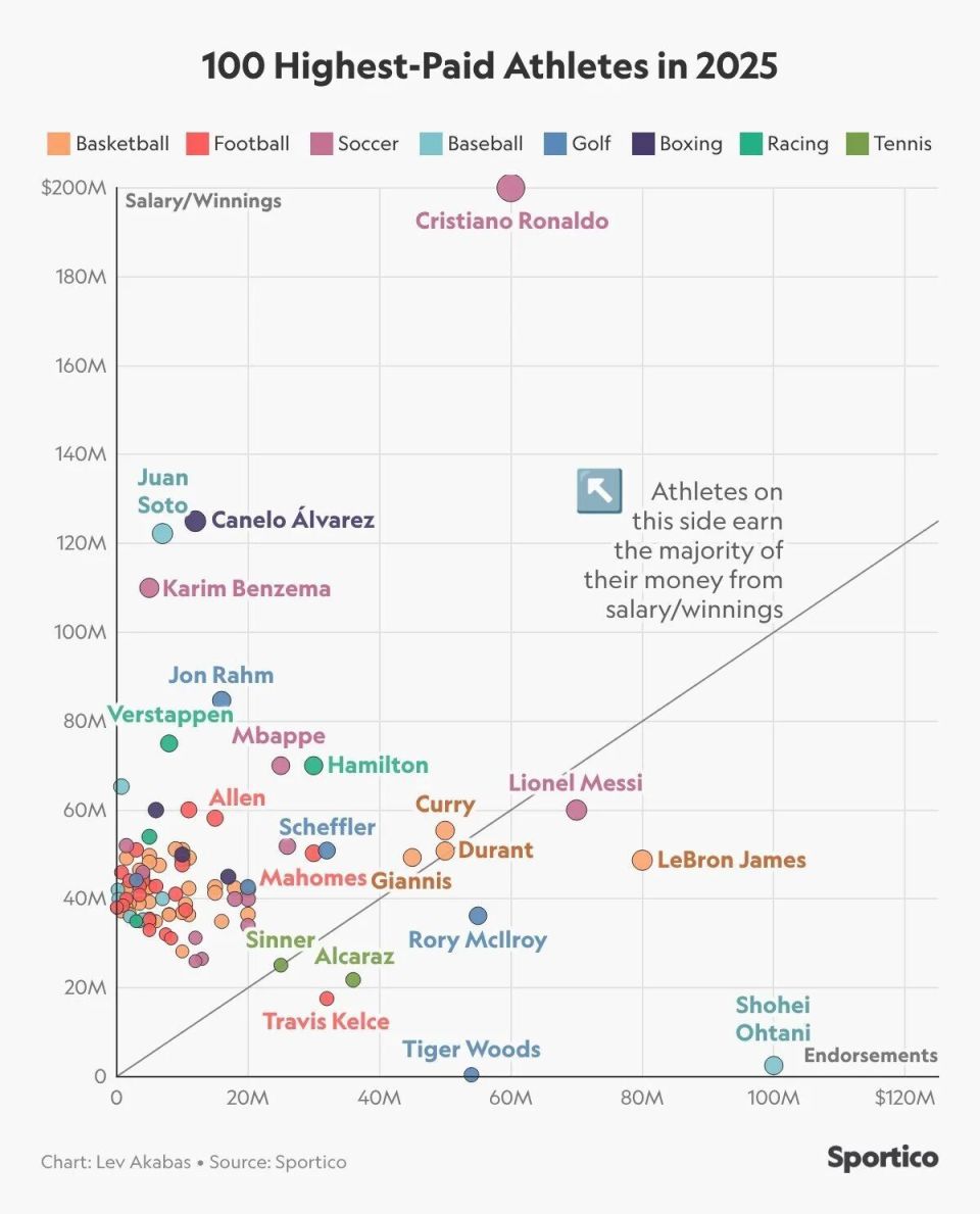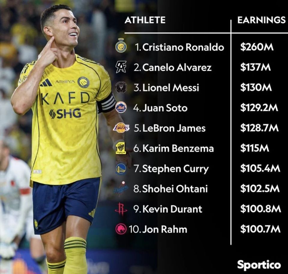 撰稿/寒冰 美国体育财经在线媒体Sportico近日公布了2025年度收入最高的100名运动员排行榜,在利雅得胜利税后年薪2亿+(美元,下同)的C罗去年总收入达2.6亿,连续3年排名榜首,是名副其实的运动圈“世界首富”。