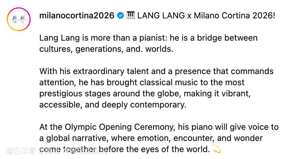 北京时间1月22日,米兰冬奥会官方宣布,郎朗受邀出席开幕式,将会在开幕式上进行钢琴演奏。