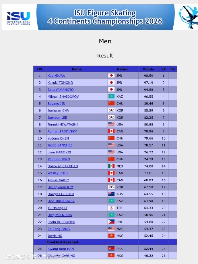 北京时间1月24日,四大洲花样滑冰锦标赛男单短节目,中国选手方面,金博洋发挥出色,得到89.46分,短节目排名第五,陈昱东排名第十,彭智铭排名第十三。短节目排名前三的依次是三浦佳生、友野一希和山本草太。