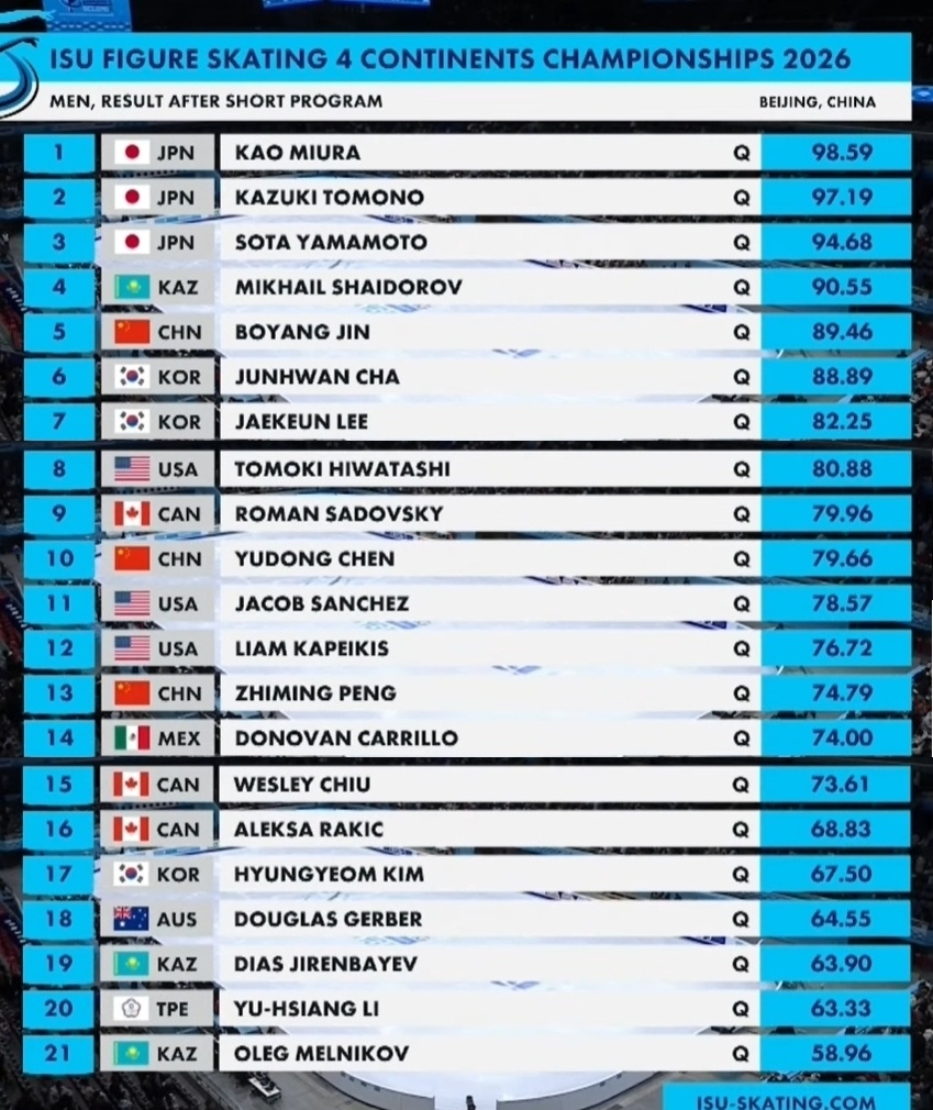 在刚刚结束的2026花滑四大洲男单短节目比拼里,继女单之后,日本军团再度包揽前三:三浦佳生98.59、友野一希97.19、山本草太94.68。