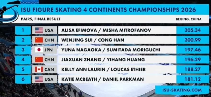 美国夫妻组合埃菲莫娃/米特法诺夫以205.34收获金牌。日本组合长冈柚奈/森口澄士以197.46摘银,张嘉轩/黄一航以196.29排名第四。