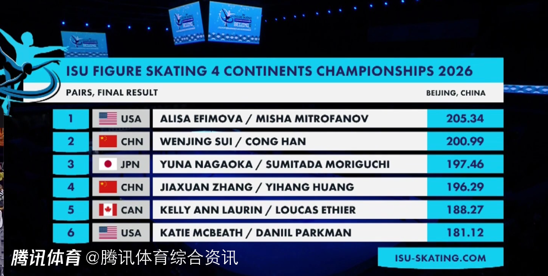 北京时间1月24日,四大洲花样滑冰锦标赛双人自由滑,隋文静/韩聪自由滑得分124.97,总分200.97最终获得亚军,美国组合艾莉莎-埃菲莫娃/米沙-米特罗法诺夫获得冠军。