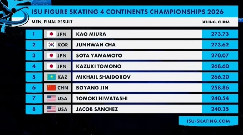 日本选手三浦佳生拿到273.73,0.11分险胜韩国车俊焕,将金牌收入囊中。另一位日本选手山本草太以270.07收获铜牌。