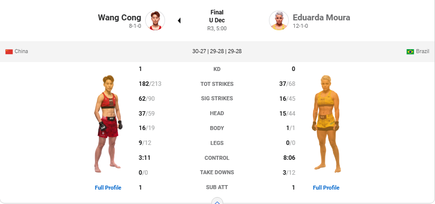 北京时间2月8日,在UFC拉斯维加斯113副赛中,中国选手王聪以 (30-27, 29-28, 29-28) 一致判定,击败对手莫拉。