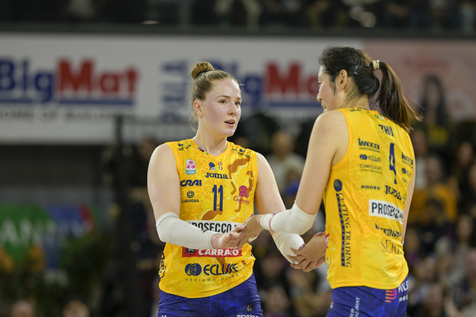 意甲女排联赛常规赛还剩4轮,本轮迎来争夺常规赛冠军的关键战、排名前两位的科内利亚诺和斯坎迪奇强强对话。在这场焦点战中,朱婷首发出场,14扣3拦贡献17分,其中进攻30扣14中1失误2被拦、双效分别为46%和36%。此外,她接了全队最多的27个一传失误4次,一传到位率和完美到位率分别为51%和40%。