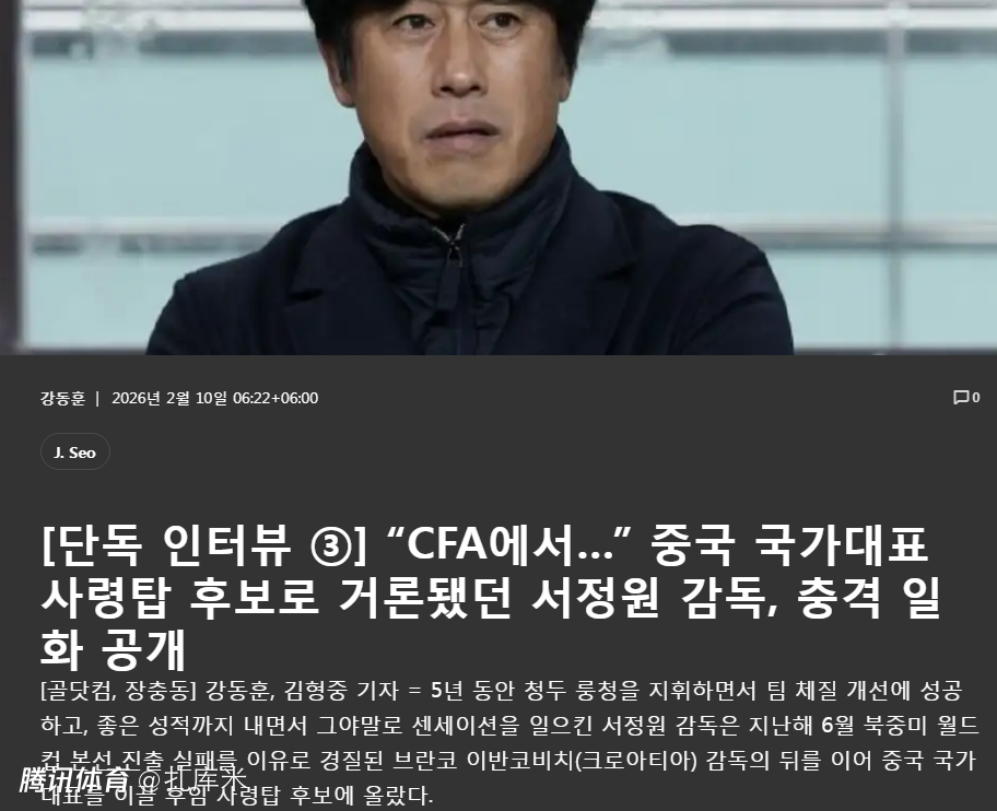 徐正源表示,过去几年,他的名字一直和中国队主帅联系到一起,“从前年开始,就有报道称我入围了中国队新任主帅候选。近年来中国队战绩不佳,国家队主帅频繁更迭,球迷关注度高涨,媒体也密集报道,我的名字在这个过程中一直被反复提及。”