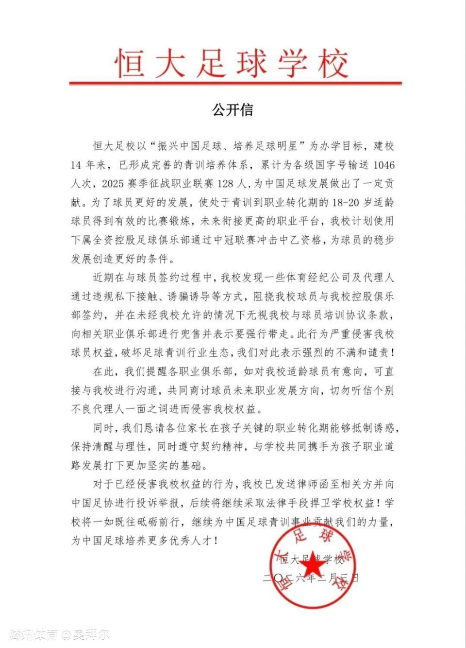 同时,恒大足校在公开信中表示,中间人“阻挠我校球员与我校控股俱乐部签约,并在未经我校允许的情况下无视我校与球员培训协议条款,向相关职业俱乐部进行兜售并表示要强行带走。”