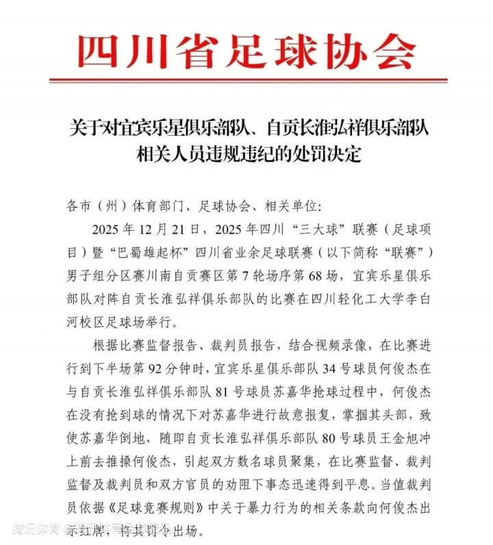 北京时间12月22日,四川省足协公布处罚决定,对于三大球城市联赛宜宾vs自贡比赛冲突事件,挥拳打人的宜宾乐星球员何俊杰被禁赛36个月,宜宾主教练王浩君停赛3场,取消宜宾足协承办省级足球赛事资格12个月,自贡球员王金旭停赛1场。