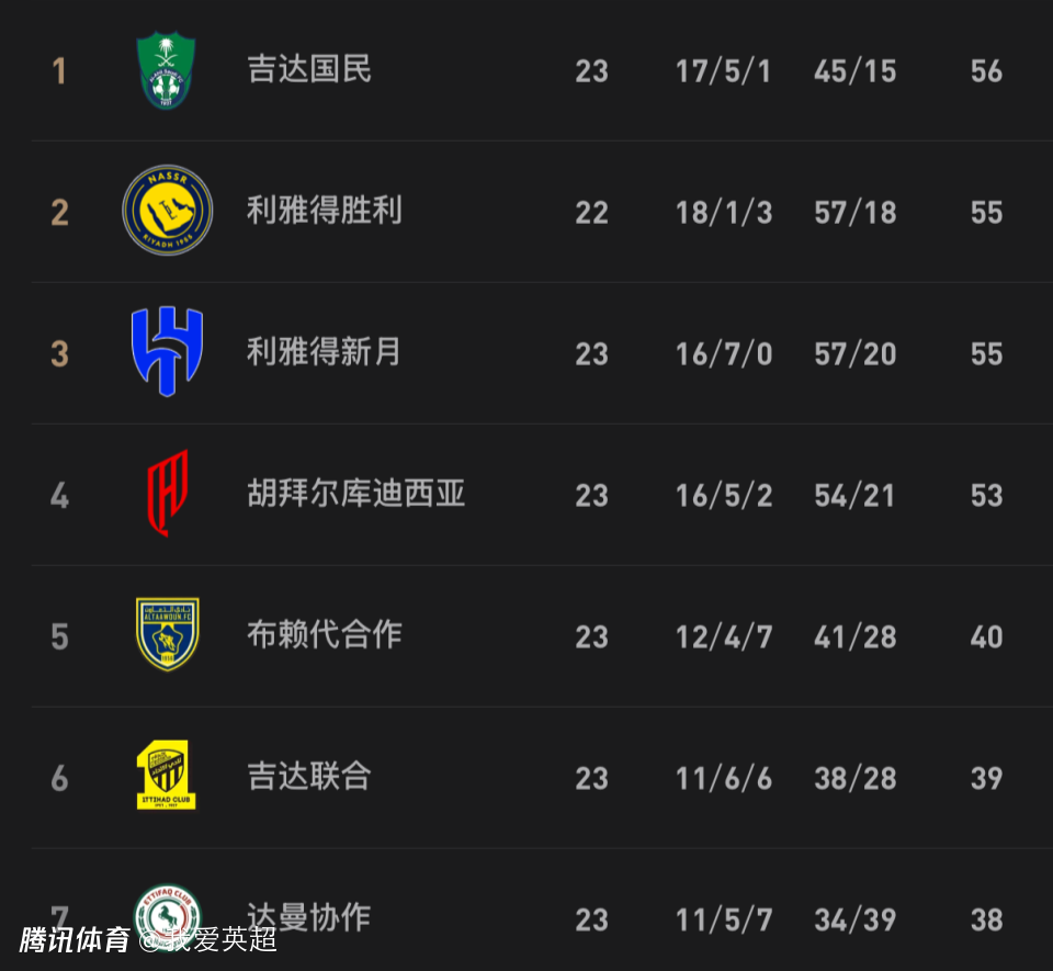 在遭遇2连平后,利雅得新月尽管依然开赛至今不败,但23场有7场平局,16胜7平积55分,已经将榜首位置拱手相让,跌至积分榜第3位。