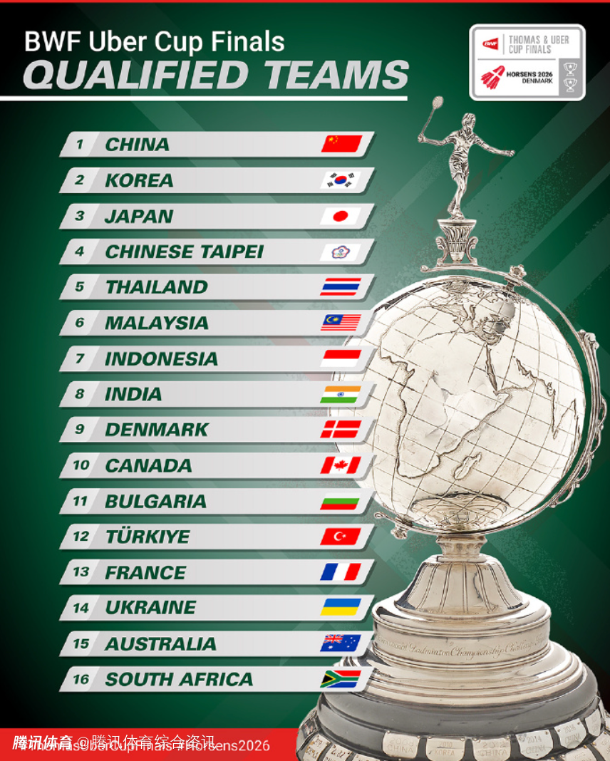 汤姆斯杯:中国、印尼、中国台北、日本、法国、丹麦、马来西亚、印度、韩国、泰国、加拿大、英格兰、德国、瑞典、澳大利亚、阿尔及利亚