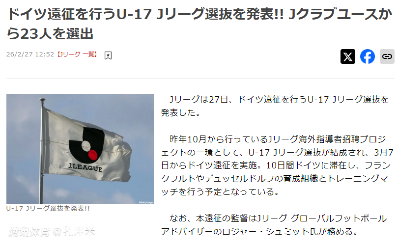 作为J联赛去年10月起启动的海外教练引进项目的一环,本次组建了J联赛U17选拔队,将于3月7日开启德国远征之旅。球队计划在德国停留10天,与法兰克福、杜塞尔多夫的青训梯队进行热身赛。