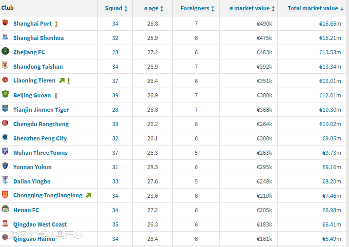 除了这5支球队之外,北京国安的身价超过1000万,被视为夺冠大热门的成都蓉城仅排名第8位。