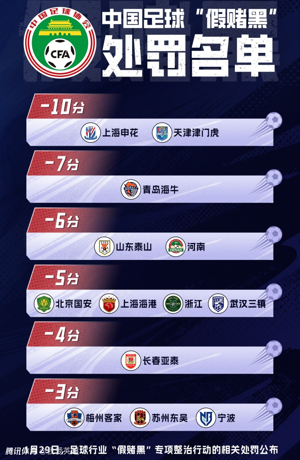 2024年9月10日,中国足协公布首批涉案人员的行业处罚,多达60人被罚,金敬道、孙准浩、郭田雨,顾超等多位中超名将在内的43人被终身禁足,老将汪嵩等17人禁足5年。