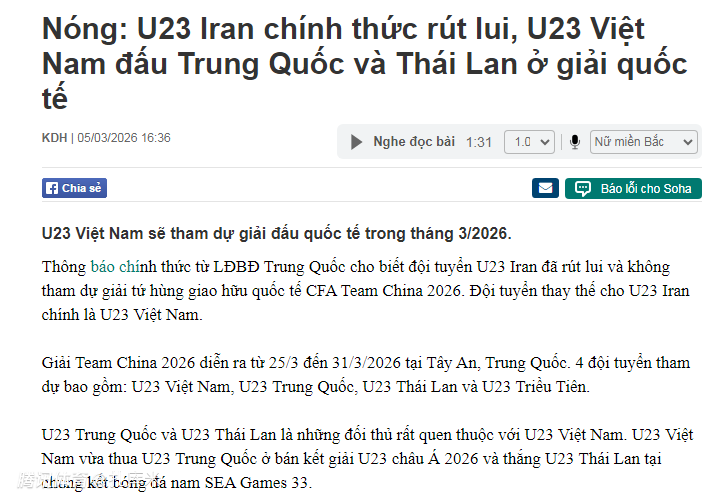 北京时间3月5日,中国足协官方宣布,西安四国赛伊朗队因故退赛,越南队取而代之。而越南媒体则披露,金相植带领的越南队将以U21球员为班底参赛。