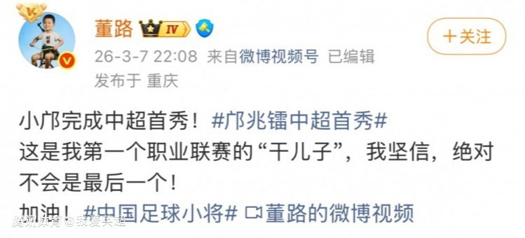 董路在社媒晒出邝兆镭替换上场的时刻,并自豪配文写道:小邝完成中超首秀!这是我第一个职业联赛的“干儿子”,我坚信,绝对不会是最后一个,加油!
