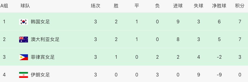 菲律宾女足1胜2负积3分排名小组第3,伊朗女足3连败净丢9球积0分垫底出局。