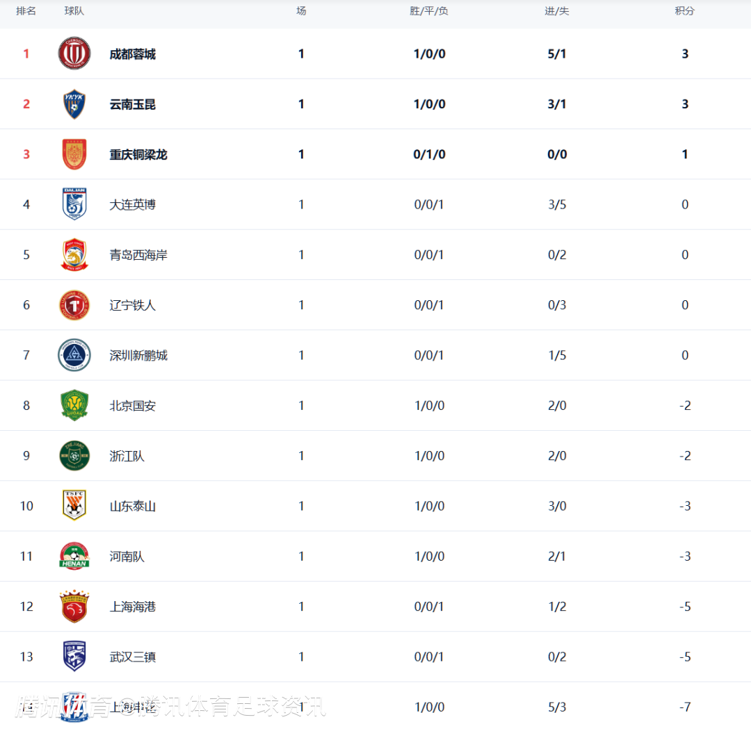 北京时间3月8日,2026赛季中超联赛首轮比赛已经全部结束。由于赛季开始前共有9支球队因反赌扫黑相关处罚被扣分,本赛季初期的积分榜形势也显得颇为特殊。目前成都蓉城和云南玉昆在首轮取胜后积3分暂时领跑,同时也有多支球队有望在下一轮摆脱负分。