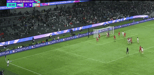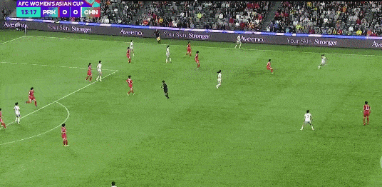 第32分钟,韩金洪右路传中,金景英包抄推射破门,朝鲜女足取得领先。