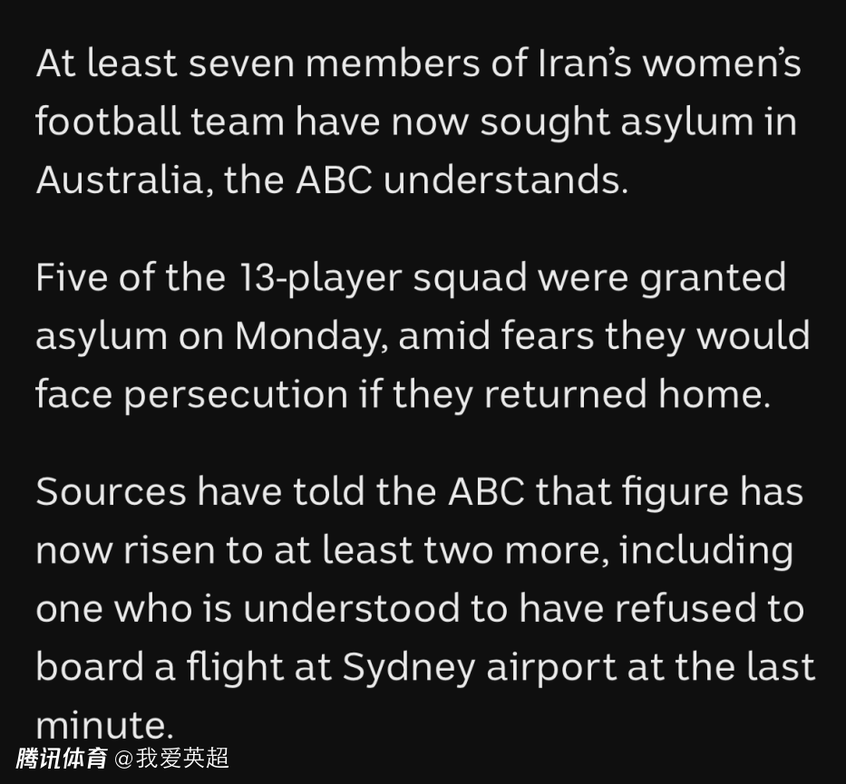 据此前报道,伊朗女足共有8名球员逃离球队,昨日逃离的5人已获得澳大利亚政府的人道主义签证,今日逃离的3人目前下落不明。