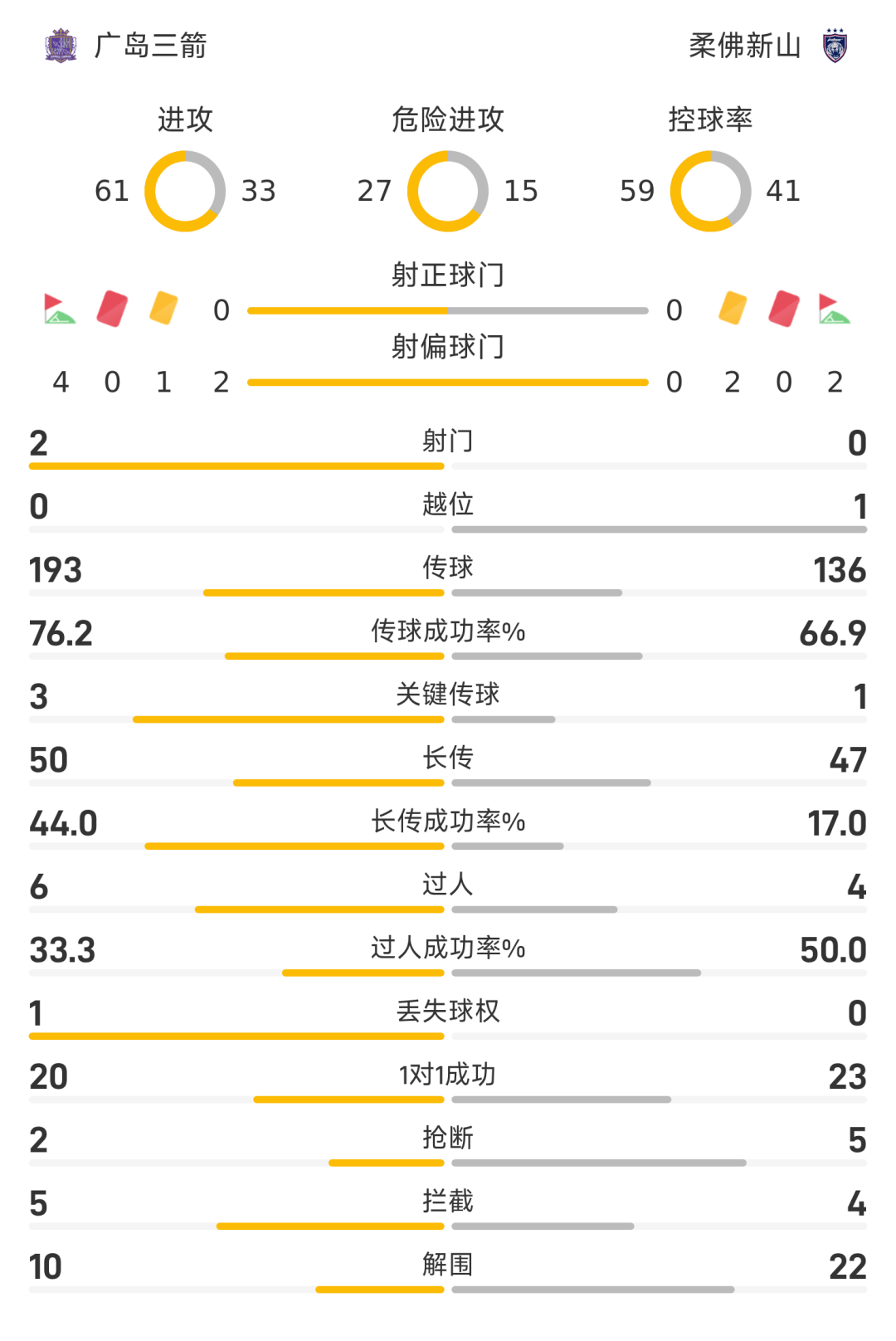 35’广岛三箭任意球送入禁区,后卫解围后杰梅恩·良扫射被封堵