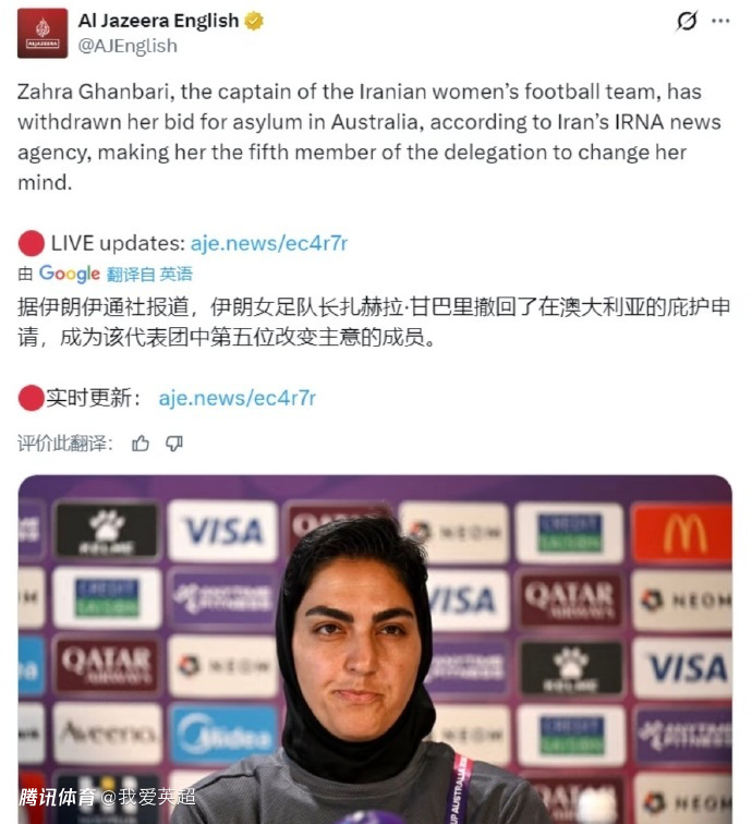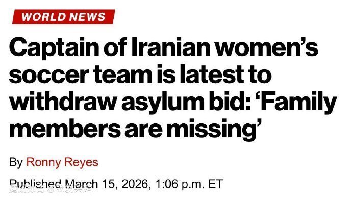北京时间3月16日,来自伊朗伊通社的最新消息,伊朗女足队长扎赫拉·甘巴里已撤销在澳大利亚的庇护申请,成为代表团中第5名放弃留澳、选择回国的成员。而根据外媒的透露,甘巴里发现家人失踪后做出这样的决定。
