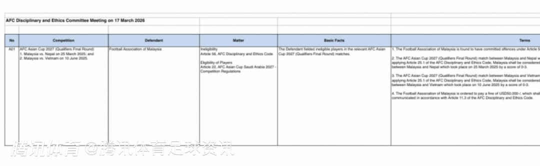 马来西亚足协被认定违反了亚足联纪律与道德准则第56条。