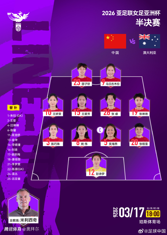 在2026年女足亚洲杯半决赛,中国女足对阵澳大利亚女足。米利西奇对首发阵容做出6个调整,在陈晨、王霜缺席的情况下,这套阵容堪称目前的最强阵容。