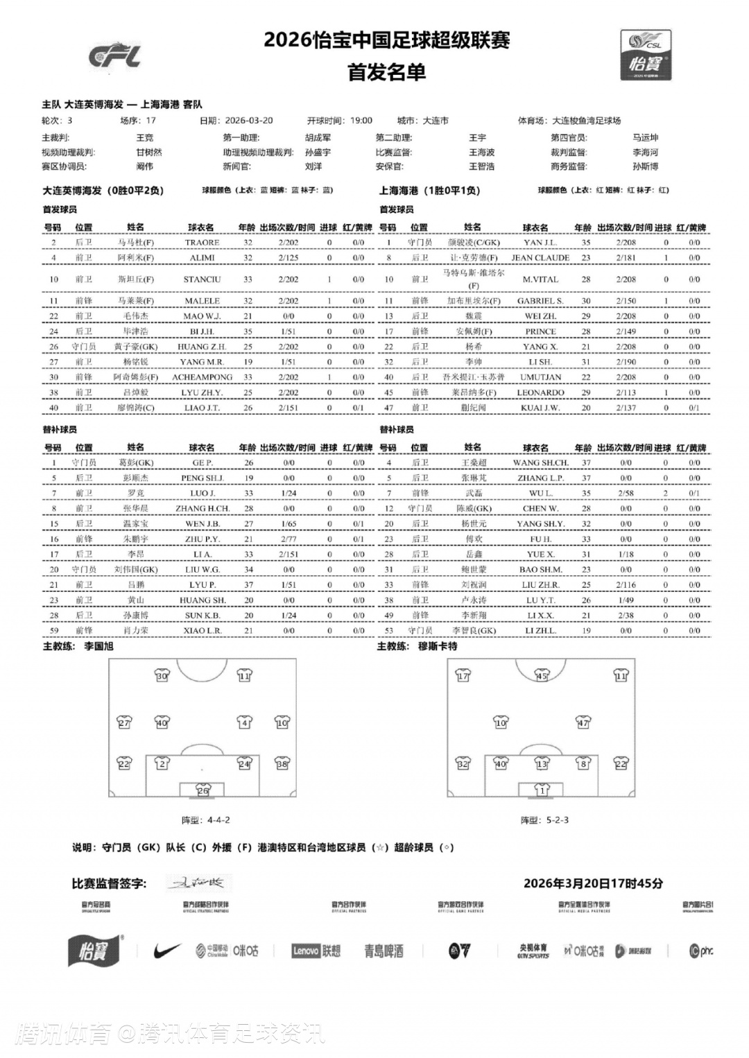 北京时间3月20日,今晚19点,本赛季中超第3轮,大连英博坐镇主场对阵上海海港,赛前,两队首发阵容公布。