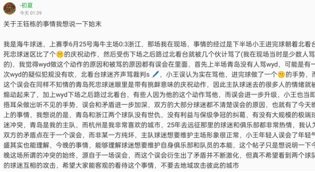 实际上,据一位青岛球迷表示,王钰栋和青岛球迷的一切都来自一场误会。这位叫“初夏”的球迷表示:“上赛季浙江队客场3-0击败青岛海牛,王钰栋曾在进完球以后朝着北看台,做出了一个闭嘴的庆祝动作,后来王钰栋受伤下场,路过北看台,被少数几个球迷骂了,而这场比赛王钰栋又被青岛大声骂了。”