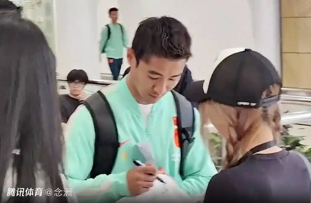 接机的球迷鼓掌欢迎,并大喊“中国队”。而包括韦世豪在内的多名国脚停下来给球迷签名、合影。