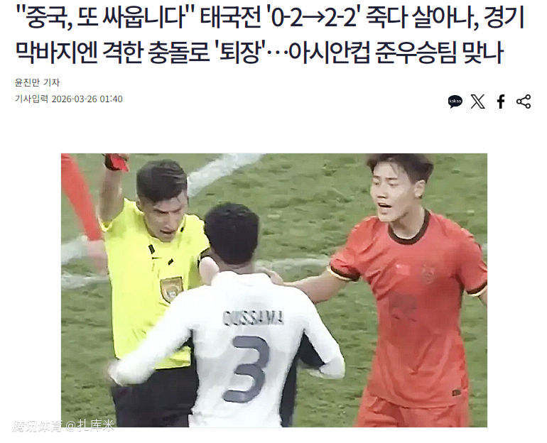 《朝鲜体育》在标题中就表示,“中国队又踢得惊心动魄,面对泰国队在0-2落后的情况下绝处逢生,但比赛结束前出现冲突,2人被罚下,要知道这可是亚洲杯亚军啊。”