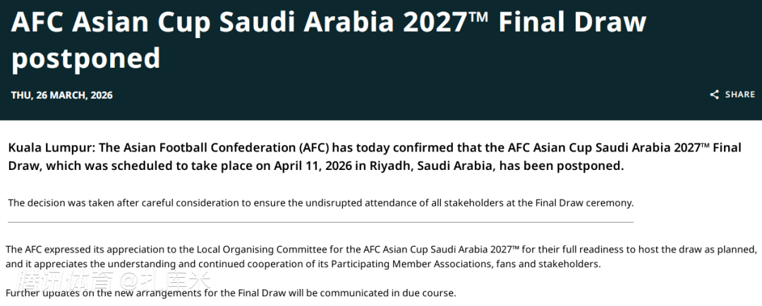 2027年亚洲杯的分组抽签仪式,原定4月11日在沙特利雅得进行,但亚足联表示,希望确保所有参与抽签的球队都能顺利出席,因此决定推迟。