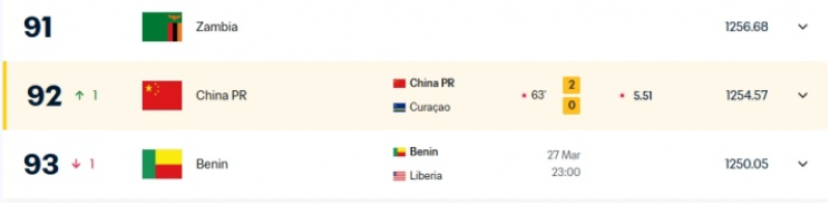 而随着国足取得两球领先,FIFA的官网也实时更新了国足的排名,上升1位升至世界第92。
