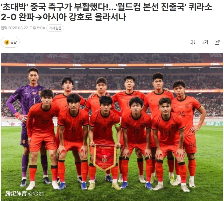 对此,韩媒Xports News打出大标题:“超级惊喜!中国足球强势回归?2-0完胜世界杯出线球队库拉索 → 迈向亚洲劲旅?”