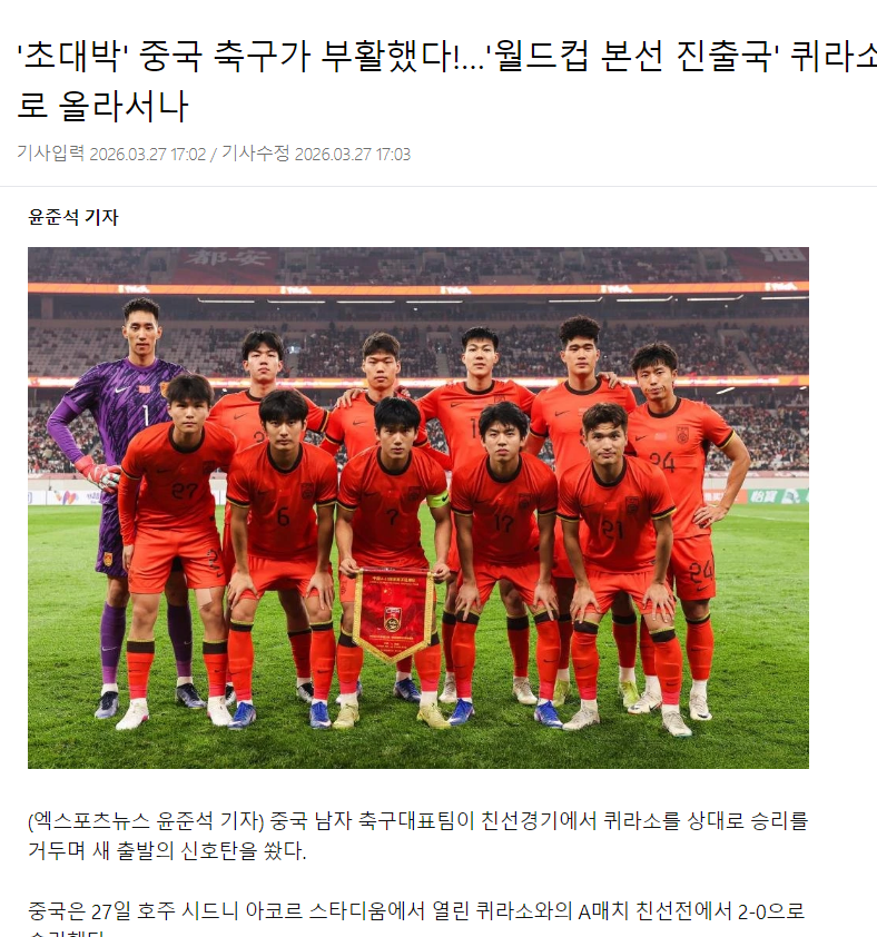 北京时间3月27日,国足2-0战胜库拉索队,邵佳一迎来执教首秀开门红。赛后,韩国媒体《X体育新闻》第一时间进行了报道。韩媒称,中国男足完胜世界杯参赛队库拉索队引起了轰动,在新帅邵佳一的率领下,中国足球强力复苏,开始跻身亚洲强队之列。