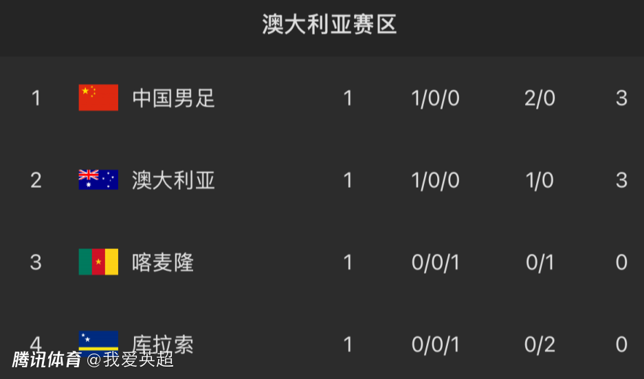 首轮战罢,中国男足和澳大利亚同积3分,喀麦隆和库拉索同积0分。中国男足凭借净胜球优势,暂列澳大利亚赛区头名。