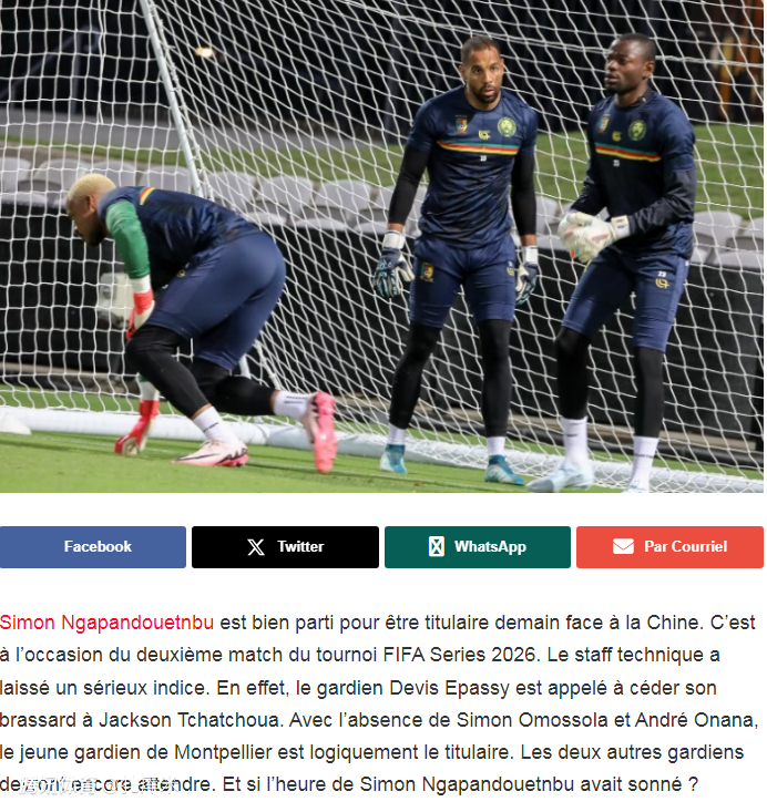 北京时间3月31日,FIFA系列赛第2轮,国足将对阵喀麦隆。根据非洲媒体的报道,喀麦隆此役将更换首发门将,年轻的恩加潘杜埃特布将迎来自己在国家队的首秀。