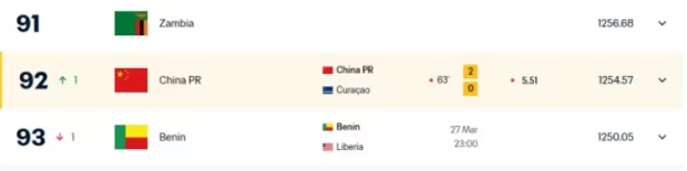 值得一提的是,在上一场国足2-0击败库拉索后,国足赚得5.51积分,FIFA实时排名+1,升至第92位。