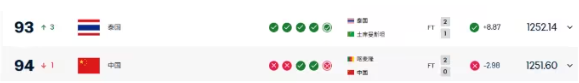 而作为对比,今早时候国足被泰国反超,实时排名跌至第94位,排名亚足联第15。