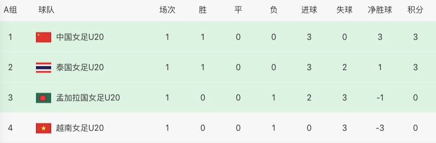 同组首轮另外一场比赛,泰国队3-2险胜孟加拉国队。首轮战罢,中国女足与东道主泰国女足都是同积3分,但中国女足凭借净胜球优势在本组暂列头名。