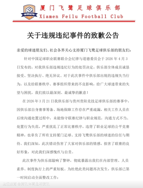 足球的魅力源于规则与尊重,厦门飞鹭足球俱乐部始终感恩球迷的一路相伴,更深知唯有坚守职业底线、敬畏联赛规则、恪守行业规范,才能不负大家的支持。此次教训刻骨铭心,俱乐部必将痛定思痛、彻底整改,以更严谨的态度、更规范的运营、更积极的面貌投入后续赛事,全力守护厦门足球的荣誉,用实际行动赢回大家的信任。