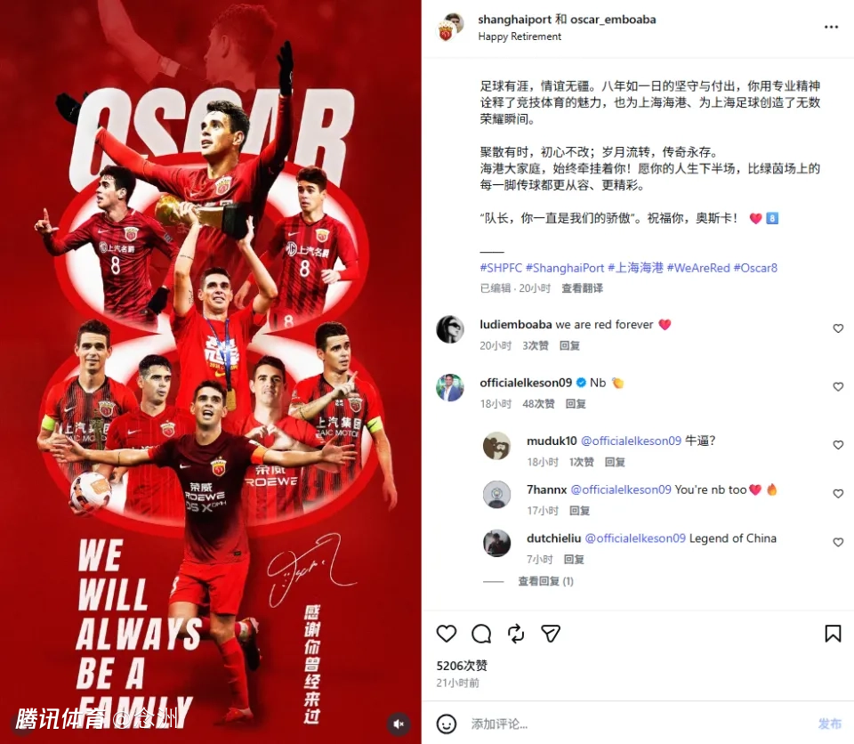 值得一提的是,奥斯卡官宣退役之后,上海海港在Instagram上同步祝福了他,而去年宣布退役的艾克森也送上了自己的祝福:Nb。