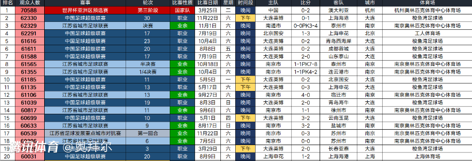 在排名前20位的比赛里,8场是苏超比赛,而且这8场比赛都是在南京奥林匹克体育中心体育场进行。不过,大连英博主场梭鱼湾9场跻身前20位,从而成为跻身前20位最多的球场。