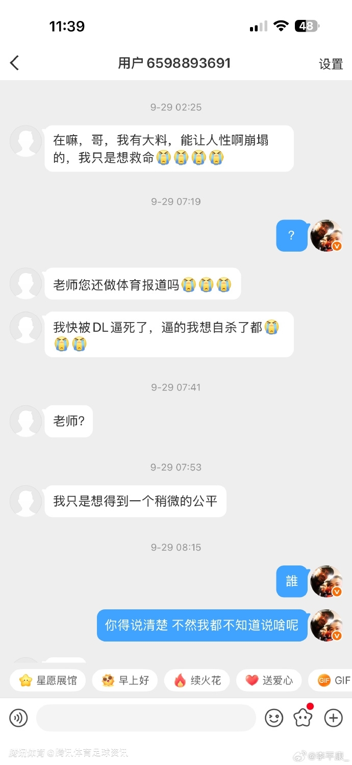 北京时间12月16日,媒体人李平康晒出了已故球迷潘硕最初向其求助时的聊天记录。李平康表示,潘硕在最早联系他时,原话中提到自己“被逼得想自杀”,并称自己因遭遇诈骗损失钱财,长期情绪低落、借酒消愁,最终发展为肝硬化。