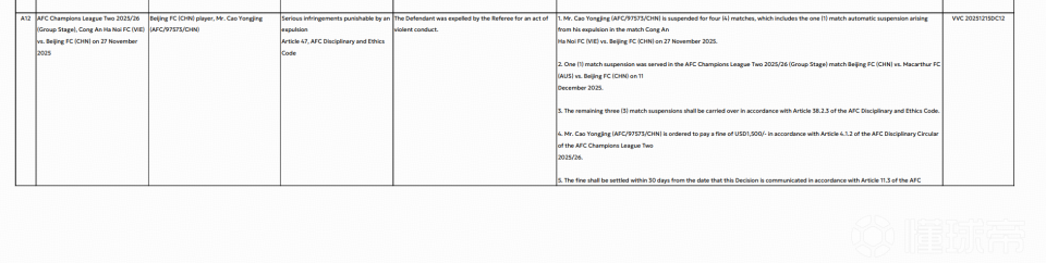 而不出意外,曹永竞也很快收到了亚足联的罚单。4场停赛中的1场,已经在北京国安对阵麦克阿瑟的亚冠二级联赛末轮比赛中执行。