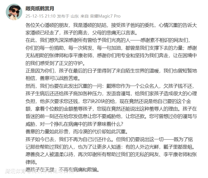 12月15日,被戴琳拖欠救命钱的球迷去世,姑姑发文控诉戴琳。