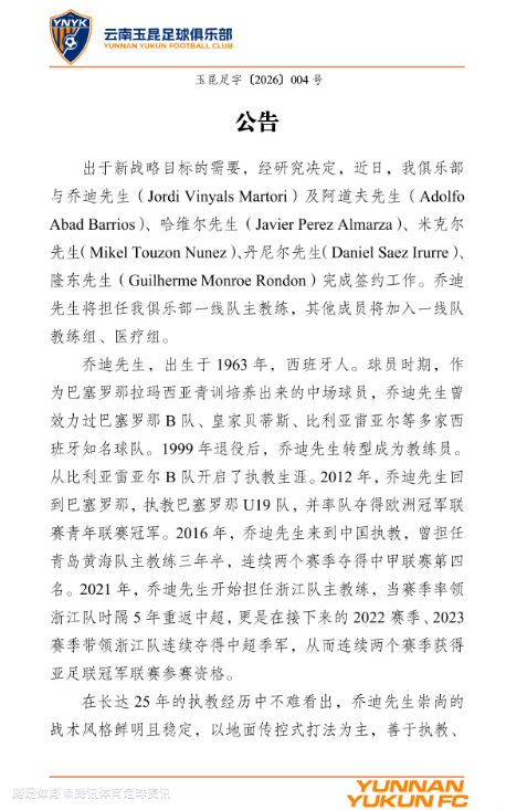 其他成员中,阿道夫先生将担任首席助理教练,哈维尔先生将担任执行助理教练,米克尔先生将担任守门员教练,降东先生将担任体能教练,丹尼尔先生将担任医疗组组长。欢迎乔迪先生及其他成员来到七彩云南、美丽玉溪,我们坚信,你们的加入将把云南玉昆带到全新的高度,期待未来我们一起向更高的目标发起冲锋,为云南面战。